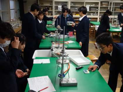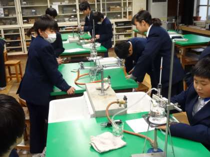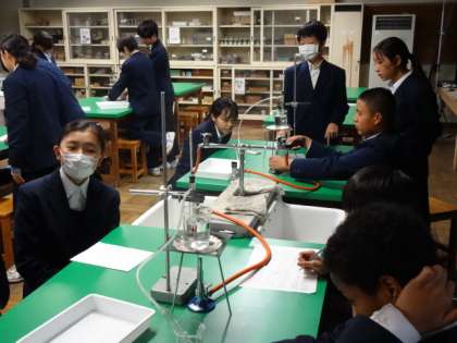 1年1組、理科。実験:エタノールが沸とうする温度を調べる。