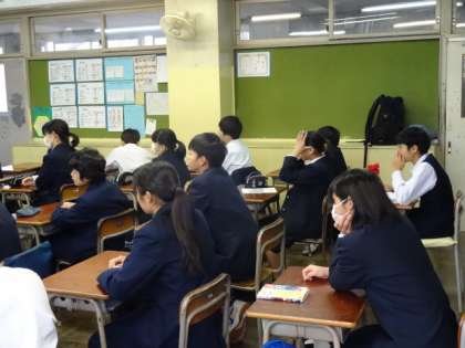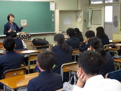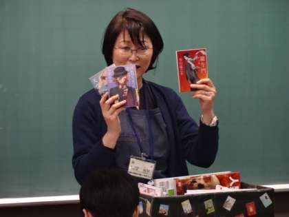 朝の会で、司書の先生が新刊本の紹介をしてくださっています。1年5組です。