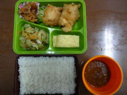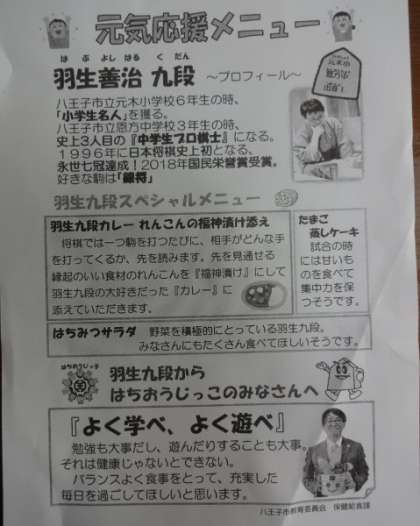 羽生善治九段スペシャルメニュー。羽生九段カレー、レンコンの福神漬け、はちみつサラダ、たまご蒸しケーキ。