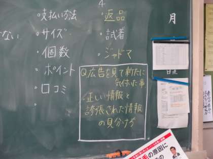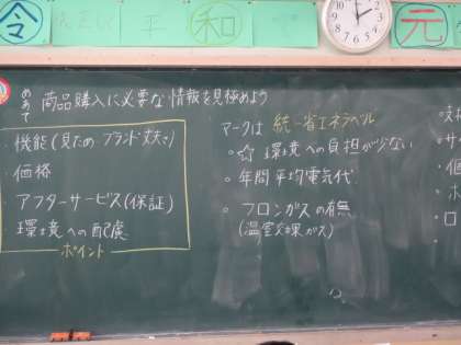 2年1組、家庭科。商品購入に必要な情報を見極めよう。正しい情報と誇張された情報の見分け方。