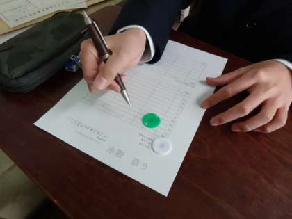 2年3組、数学。確率。コインを2枚投げて調べます。