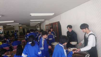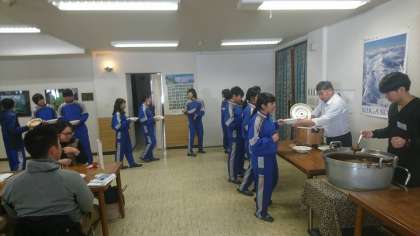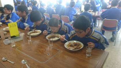 昼食です。ハヤシライスです。おかわりに長蛇の列です。