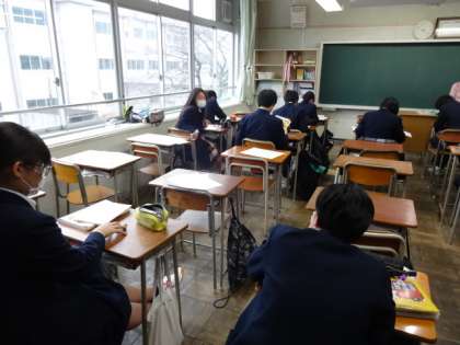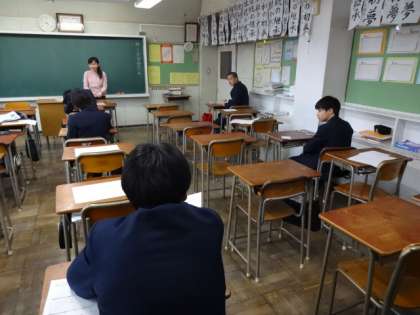 今日は私立高校推薦入試と都立高校推薦出願の日です。そのため教室に残って授業を受けている生徒が少ないです。一人ひとり自分の進路に向けて頑張っています。3年2組。