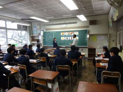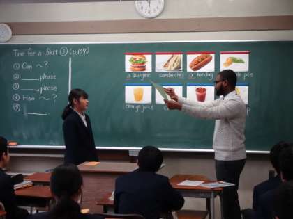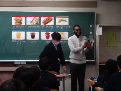 1年4・5組、英語。今日からALTのユージン先生がいらっしゃっています。食事と飲み物を注文して、代金を払う場面の会話練習です。