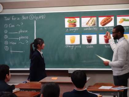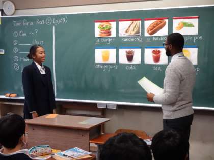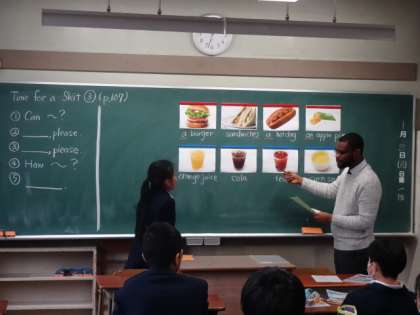 1年4・5組、英語。今日からALTのユージン先生がいらっしゃっています。食事と飲み物を注文して、代金を払う場面の会話練習です。