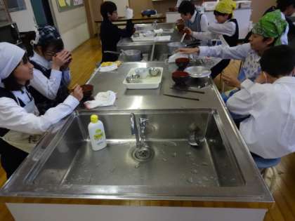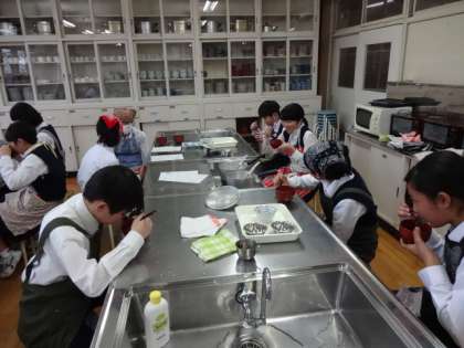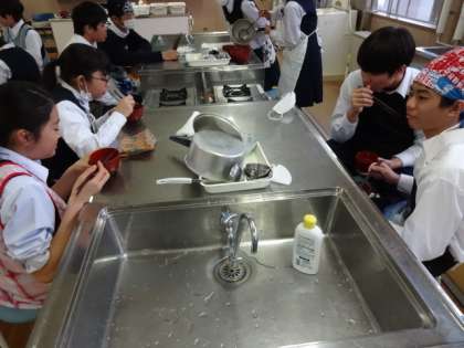 1年3組、家庭科。お吸い物の調理実習です。和食を支えるだし(旨味)について知ろう。自分たちで調理したお吸い物はおいしいですか?