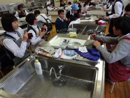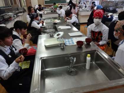 1年3組、家庭科。お吸い物の調理実習です。和食を支えるだし(旨味)について知ろう。自分たちで調理したお吸い物はおいしいですか?