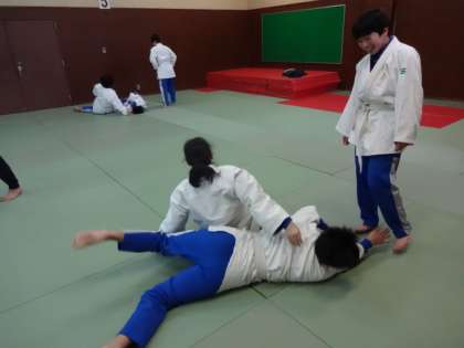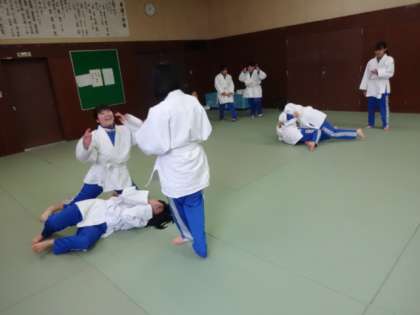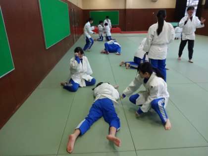 2年1・2組、体育女子。柔道。背中合わせから寝技の練習です。