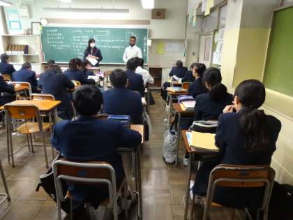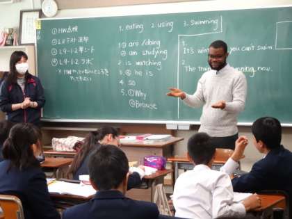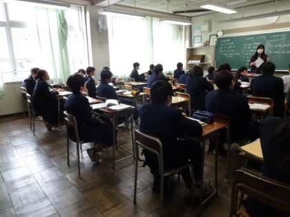 1年4組、英語。ユージン先生がテストの様子をほめてくれました。このまま続けましょう!