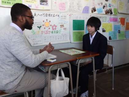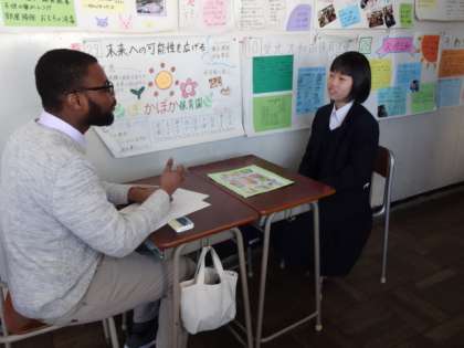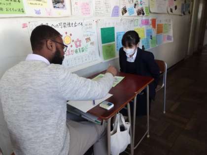 2年1・2組、英語。このクラスはユージン先生のスピーキングテストです。