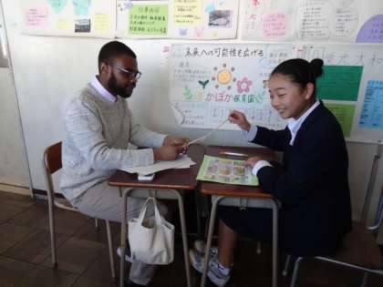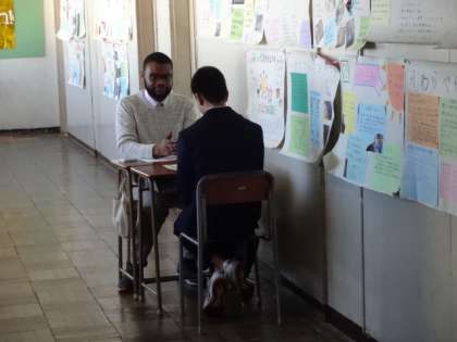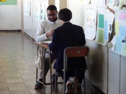 2年1・2組、英語。このクラスはユージン先生のスピーキングテストです。