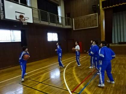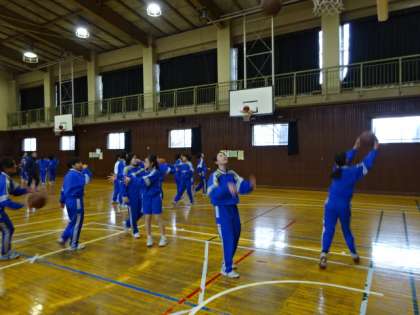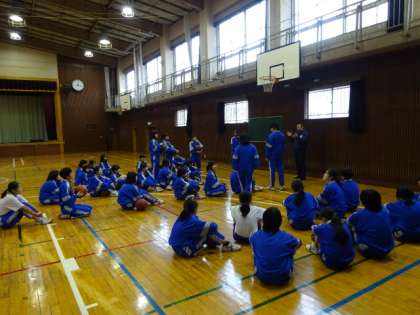 1年2・3組、体育女子。バスケットボールです。バスケットボール部員が上手にリードしています。