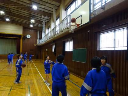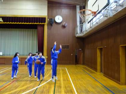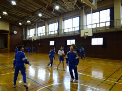 1年2・3組、体育女子。バスケットボールです。バスケットボール部員が上手にリードしています。