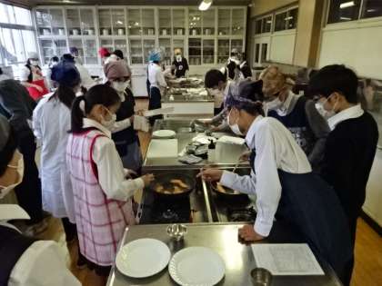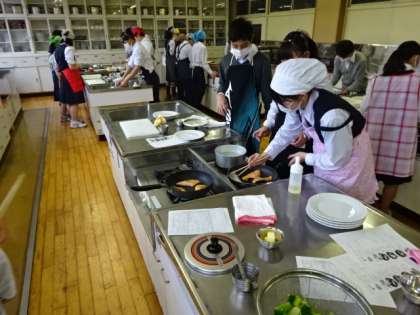 1年4組、家庭科。調理実習です。「鮭のムニエル」です。