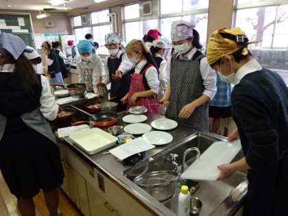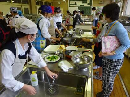 1年4組、家庭科。調理実習です。「鮭のムニエル」です。