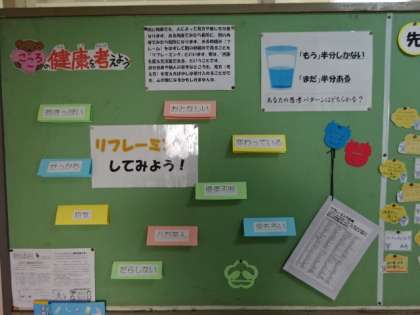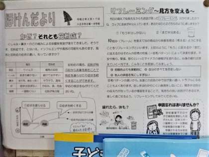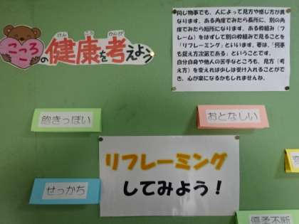 保健室前の掲示です。リフレーミングとは「フレーム」をかえて見ること。例「いいかげん」⇒「おおらか」「寛大な」