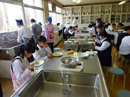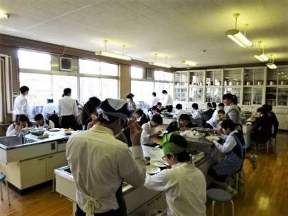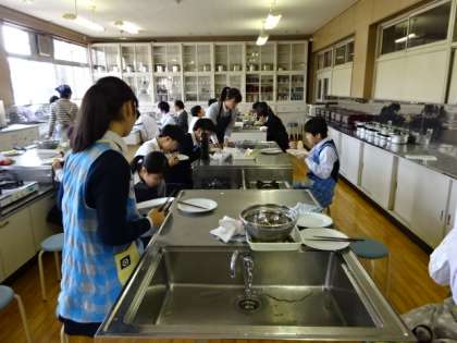 2年1組、家庭科。調理実習です。ECOポイントを意識して調理しよう。クリームパスタ。