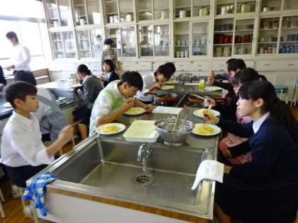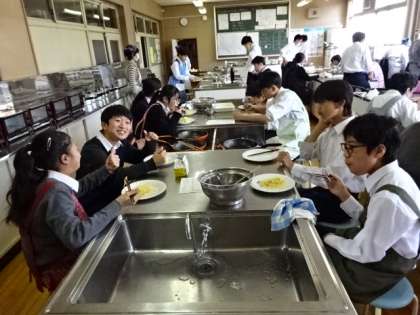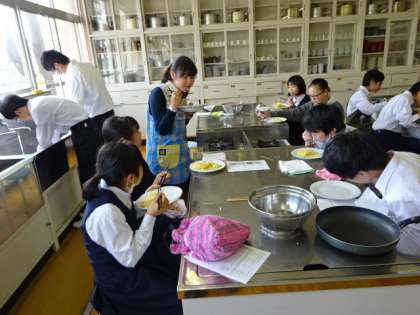 2年1組、家庭科。調理実習です。ECOポイントを意識して調理しよう。クリームパスタ。