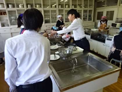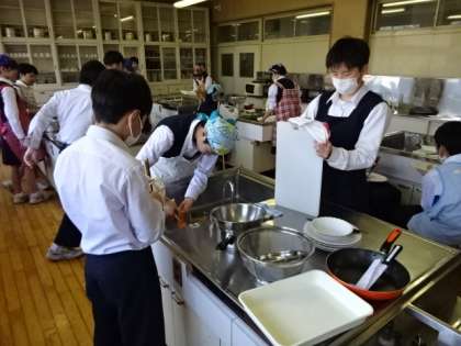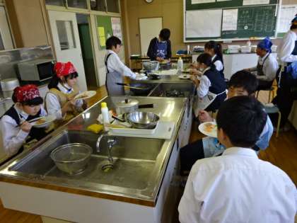 2年1組、家庭科。調理実習。魚の料理をしよう。鮭のムニエル。調理が終わり実食中。