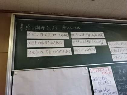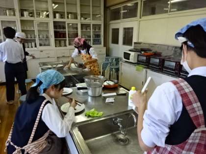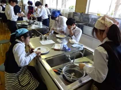 2年1組、家庭科。調理実習。魚の料理をしよう。鮭のムニエル。調理が終わり実食中。