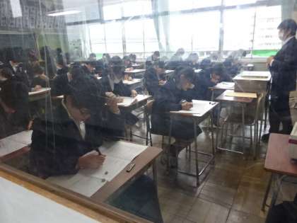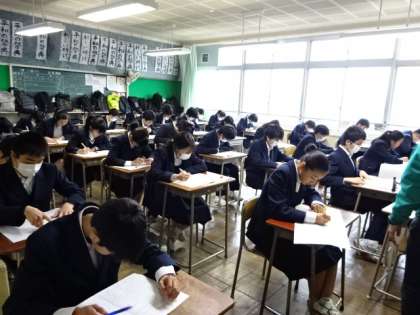 今日は学年末考査2日目です。英語の試験中です。頑張っています。2年生。
