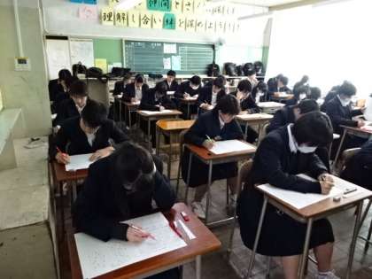 今日は学年末考査最終日です。3年生にとっては、中学校生活最後の定期考査でした。最後の試験は音楽でした。よく頑張っていました。4組。