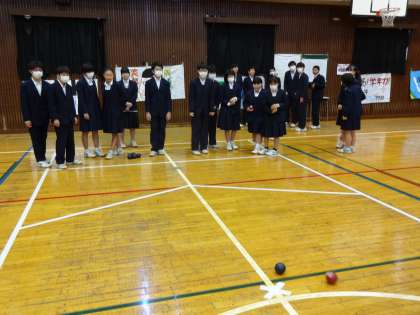 1時間目に2年生がボッチャ大会を行いました。当初は、今日は全校で有明体操場に2020ジャパンパラボッチャ競技大会の見学の予定でした。