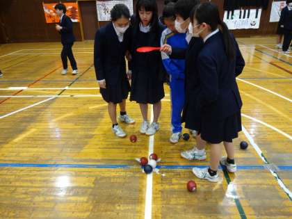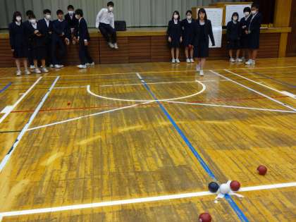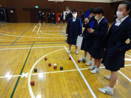 1時間目に2年生がボッチャ大会を行いました。当初は、今日は全校で有明体操場に2020ジャパンパラボッチャ競技大会の見学の予定でした。