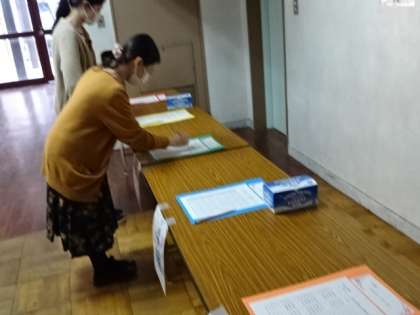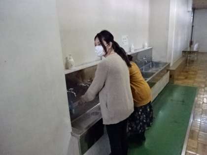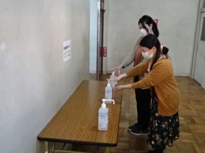 格技室を出て左側に手洗い所があります。その先に消毒液を置きました。その後、受付を行ってください。