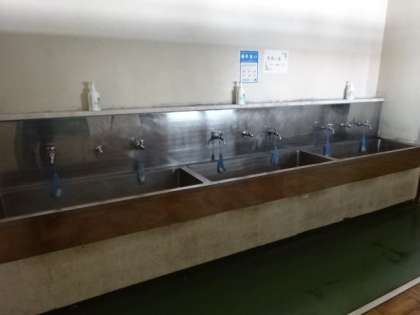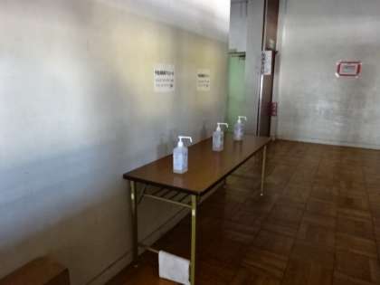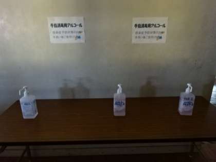 格技室を出てすぐ左に曲がり手洗い場です。その隣でアルコール消毒をどうぞ。