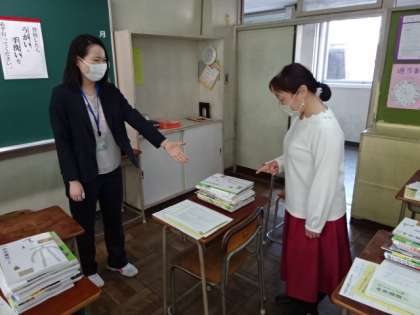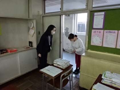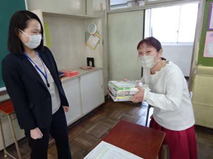 自分の机の上に配られている教科書を受け取って帰ります。1年生は教科書の冊数が多いので大きめのカバンが必要です。 スクールサポートスタッフとアシスタントティーチャーの方にご協力いただきました。