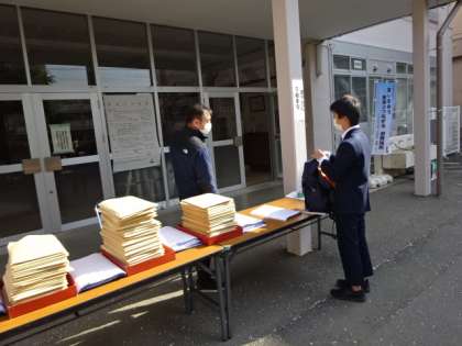3年生の教科書配布の様子です。かなりの数の生徒が、eライブラリに一生懸命取り組んでいるようです。