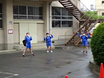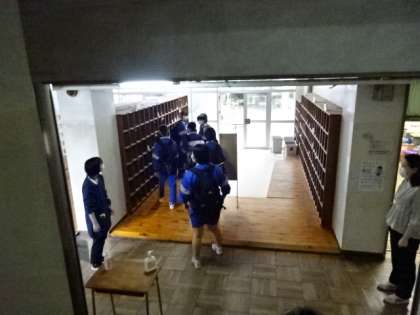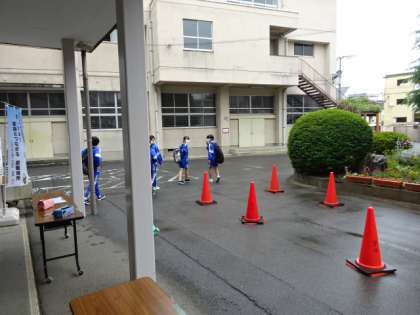 3年1組と7組の生徒が下校します。次のクラスの登校までに、先生が教室を除菌・消毒します。