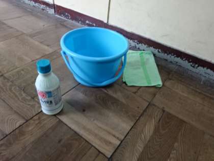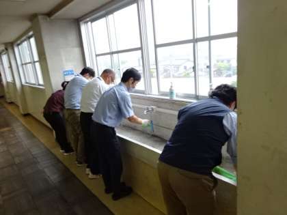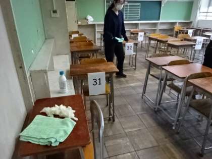 3年1組と7組の生徒が下校します。次のクラスの登校までに、先生が教室を除菌・消毒します。