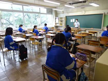 今日は3組と4組が時差登校少人数授業です。3組の様子です。約2月半ぶりの授業です。4つのグループに分かれています。