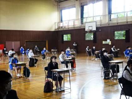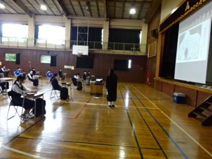 今日の3年生は、体育館で、クラス別の時差登校です。1組。