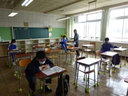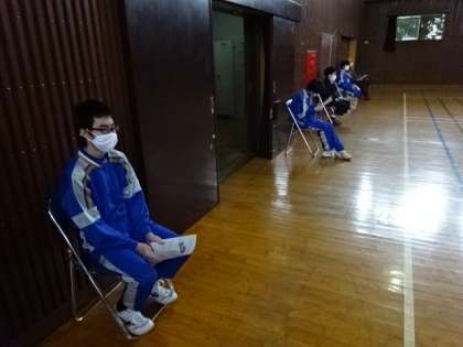 今日の3年生は、体育館で、クラス別の時差登校です。7組。1組と一緒に修学旅行について授業を受けた後、クラスで授業です。