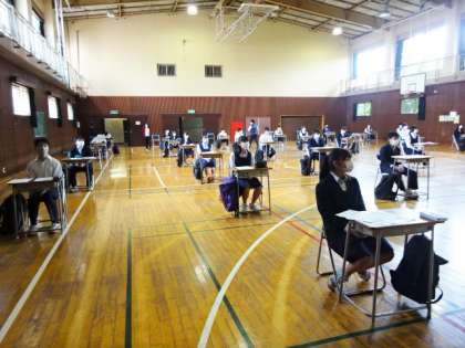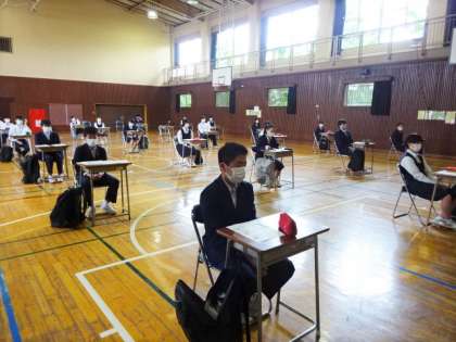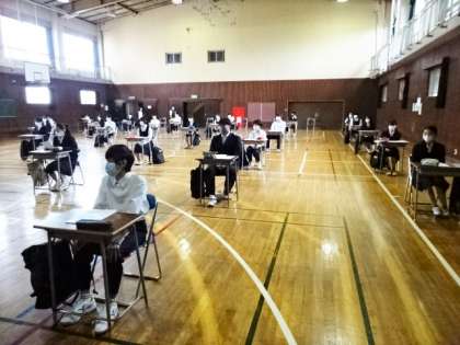 今日の3年生は、体育館で、クラス別の時差登校です。3組。