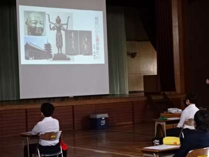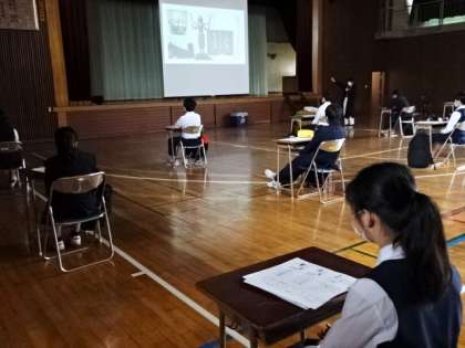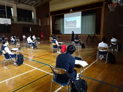 今日の3年生は、体育館で、クラス別の時差登校です。4組。
