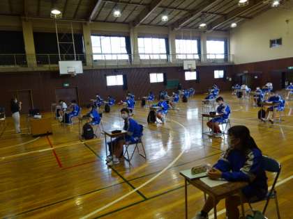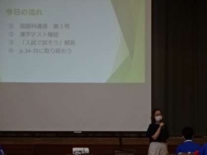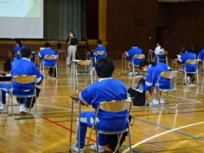 体育館で行っている3年生の時差登校クラス別授業の様子です。2組の国語の授業です。