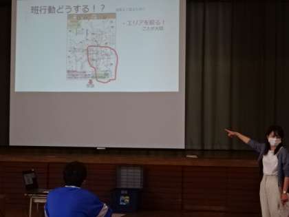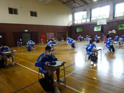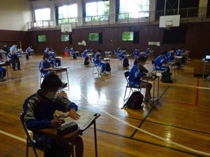 3年生は体育館で時差登校クラス別授業です。4組、総合的な学習の時間。