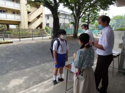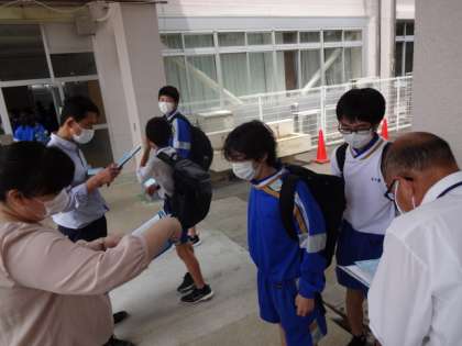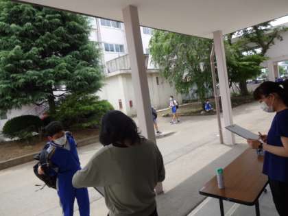 新型コロナウィルス感染症対策。登校した生徒は、先ず、校舎に入る前に健康カードのチェックを受けます。登校前の検温を忘れた生徒は、ここで検温を受けます。