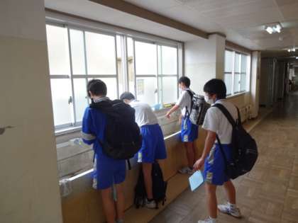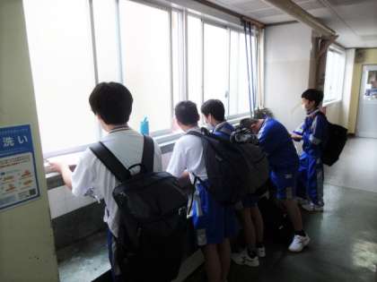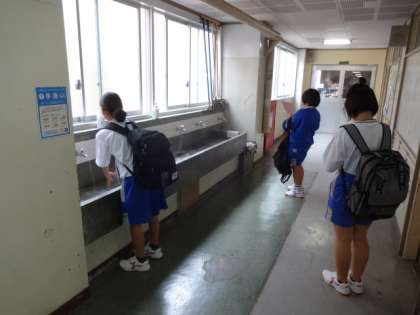 新型コロナウィルス感染症対策。校舎に入ったら、教室に入る前に手洗い・うがいを行います。