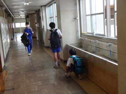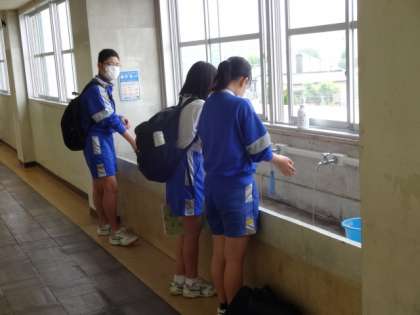 新型コロナウィルス感染症対策。校舎に入ったら、教室に入る前に手洗い・うがいを行います。