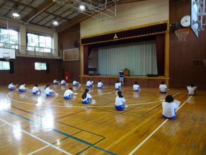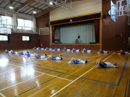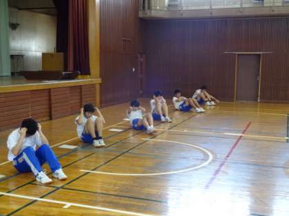 3年生の授業の様子です。3年1組、体育。距離を取って、マスクを外しています。