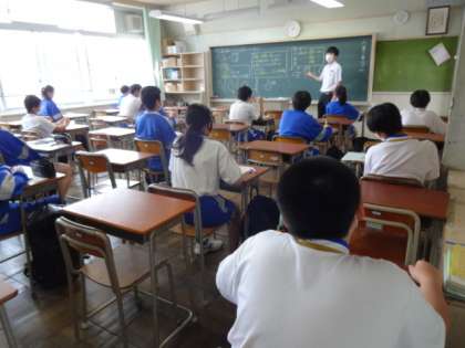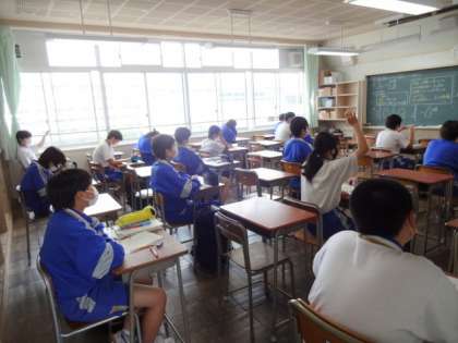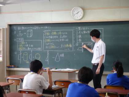 2年1組、数学。「面を動かしてできる図形について知ろう」