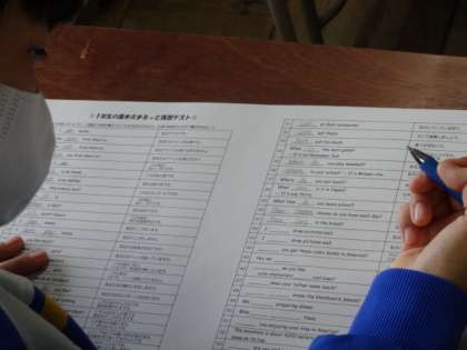2年2組、英語。「1年生の基本文まるっと復習テスト」がんばれ!