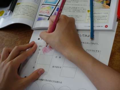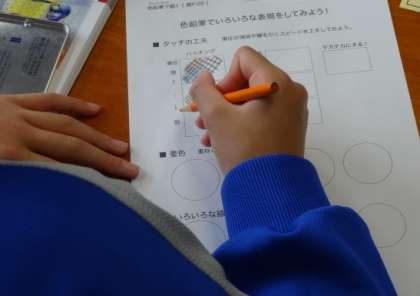 1年4組、美術。「美」しく、つくる、感じるための「術」を学ぼう! 色鉛筆でいろいろな表現をしてみよう!!
