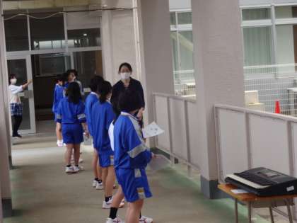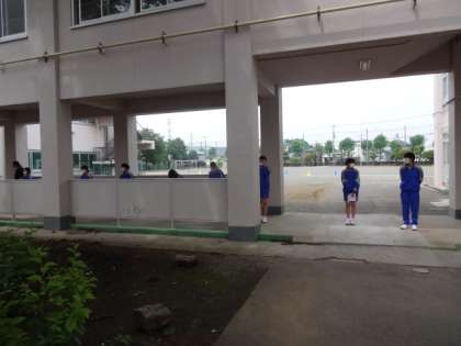 1年2組、音楽。授業の後半、少しの時間だけ、外で、距離をとって、マスクをしたまま、校歌を歌ってみました。