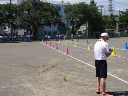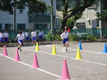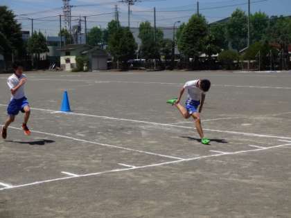 3年生は、今日から、クラス全員で行う教科の授業が始まりました。1・2組、体育男子。「短距離走」